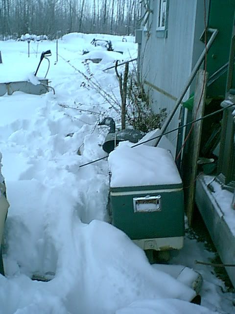 The moose was prolly a couple years old and had been walking around the house, had made it all the way around it with only mom's dog knowing we was being invaded, and eating the grass and stuff that grows along the perimeter of the building where the deep snow had not buried it.