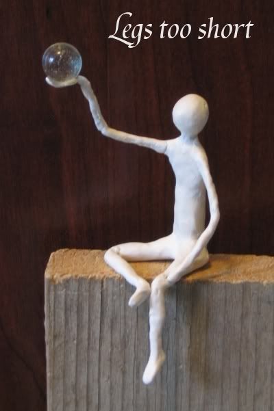 Thankfully this is still the first stage, so I have not yet fired the figure and can strip the polymer clay off the legs, experiment with if you can extend them, and then put clay on all over again.
