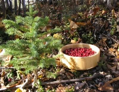 I took the below picture while out there picking cranberries, I really like the way the bowl filled with cranberries looks nestled in behind the small spruce sapling.
