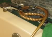 Yup. You guessed it. He put a kitchen sink faucet in our bathroom for our bathtub. Don't believe me? May I present my bathtub faucet - which includes now the shower-head extension my brother added to the hand sprayer for us.I am definitely in the market for a new bathtub faucet, been too long since that was installed and we are well past tired of filling the bath with a kitchen faucet.