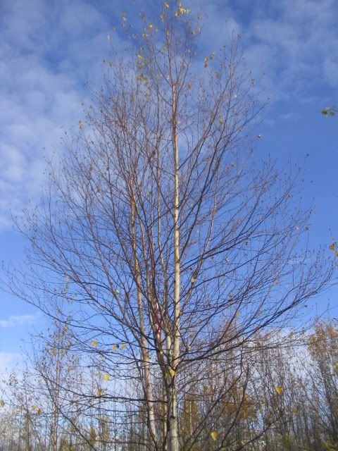 Here's a picture of the barren three set against the almost clear skies that I have today. I find it amusing that the last few leaves are mostly at the top of the tree. Not sure why, I guess they are the newest leaves so held out longer than the other ones that died off and fell to the ground?